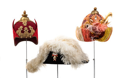 comprised of a soldier hat and a courtier hat from the 1975 production Love of Three Oranges by Sergei Prokofiev; together with a black velvet hat with plumes, size 6 7/8. Two hats labeled: Tirelli Costumi Roma.Black velvet hat labelled: Lynch & Kelly Inc, Society Regalia. Utica N.Y.