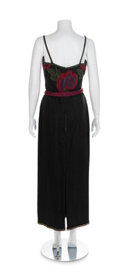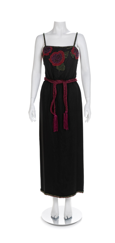 Dress; black silk crepe with front and back beaded bodice, beaded straps and hem, lined in black with a back zip closure. Together with a matching sheer cover and a self-tie belt. Unlabeled.