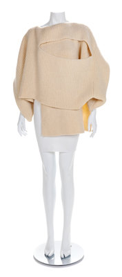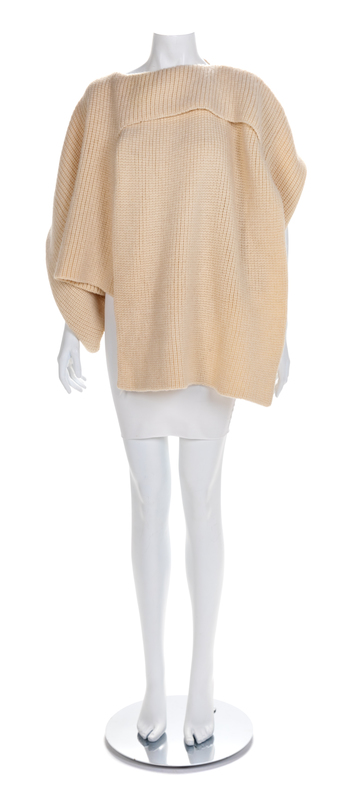 Cream wool knit pull-over sweater in a rectangular panel with the front panel of a heavyweight cream wool knit and the back in a matching woven wool. Top of the knitted front folds over with an opening in the knit for a long hanging panel, each side hem is closed with slits for arms, unlined. Label: Tricot / Comme des Garons; Made in Japan
