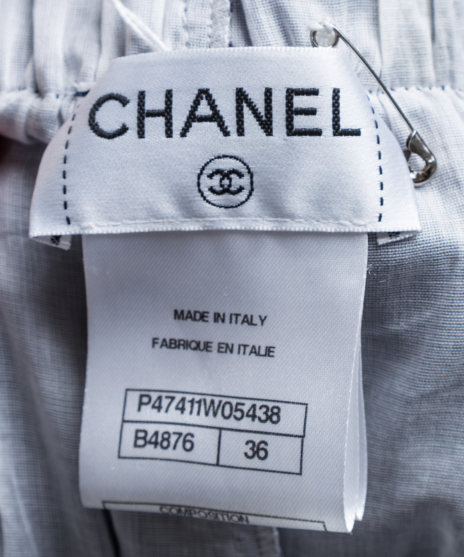 Cotton blend blue floral lace underlined with white cotton and finished with a black sheer elastic waistband and scalloped hem. Label: Chanel