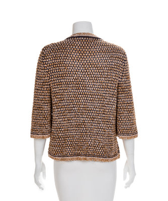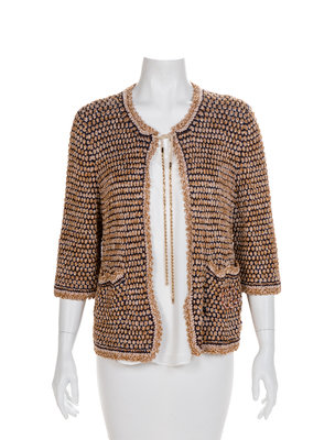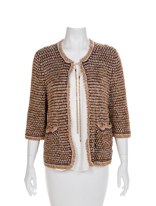 Cardigan in pink, tan and blue knit with a crew neckline finished with a goldtone chain marked with CC logo and 3/4 wide sleeves. A patch pocket is placed on each hip and closed with a goldtone CC logo button.Label: Chanel