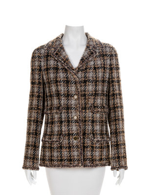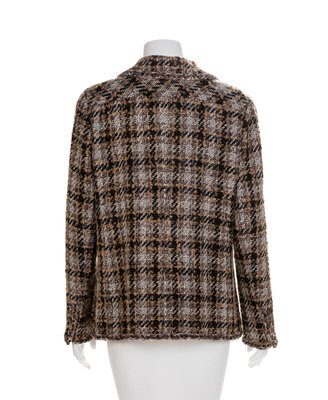 Wool blend tweed jacket in a brown, black and white plaid. Jacket has a notched collar, long sleeves and a flapped patch pocket on each hip. The jacket and sleeve hem closes with goldtone and CC logo buttons. Black silk blend lining and internal hem chain. Label: Chanel / Made in France