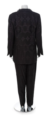 The patterned black jacket has a black sheer collar and lapel that extends to the hem. The jacket has small shoulder pads, long sleeves and hangs open at the center front with no closures. The lined and tapered trousers have a wide waistband, a panel of black sheer sewn down the side seams and a zip and button closure. Jacket label: Christian Dior / Boutique / Paris / 57505Pants label: Christian Dior / Boutique / Paris / 38947