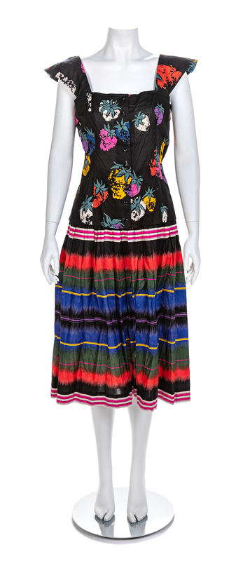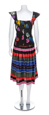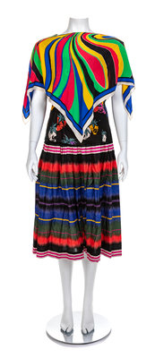 Consisting of a top, skirt and poncho scarf. Top is made of black cotton printed with a strawberry pattern with shoulder tabs and a center back button closure. Black skirt printed with horizontal bands and pleated into a wide top-stitched yoke and closed at the center back with a zipper. The poncho scarf is cut from a printed square scarf. Label on top and skirt: Emanuel Ungaro Parallele Paris / Made in ItalyScarf is unlabeled
