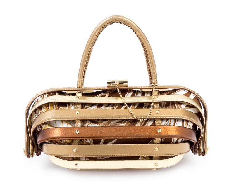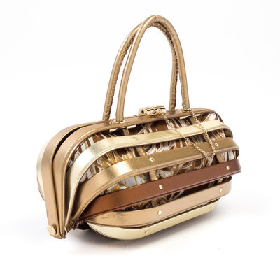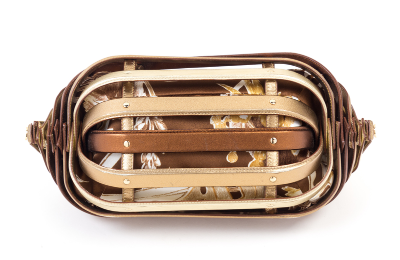 Salvatore Ferragamo Gold and Bronze Leather "Cage" Handbag, 1990-2000s 12" x 6" x 5"; Handle drop: 4"