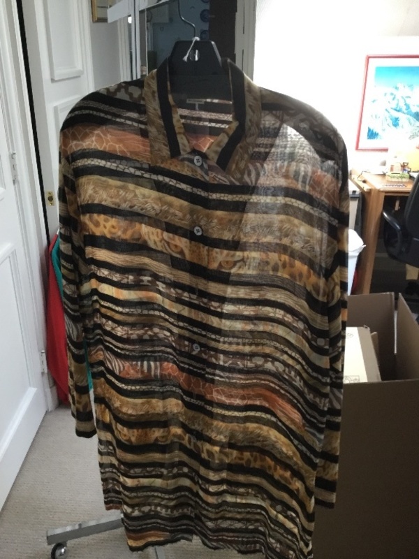 Cotton collared tunic with a button up front, two front pockets and an animal print motif throughout. Label: Ferragamo