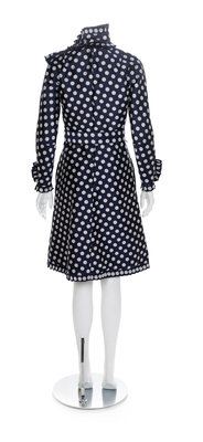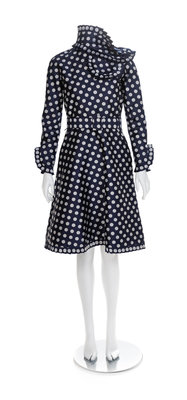 Navy blue silk dress woven with white polkadots with a crew neckline, long sleeves and an a-line skirt gathered into the wiastline. The neckline is embellished with an attached self-fabric scarf, which closes at the neck with a snap. The edge of the scarf and hem of the sleeves and skirt are edged with pleated self fabric. The dress is underlined with a blue sheer fabric and closes down the center back with a zipper and hook and eye closure. The skirt features a slip pocket on each side seam. Separate self-fabric belt closes with buckle. Label: Geoffrey Beene Boutique / Union Made Label