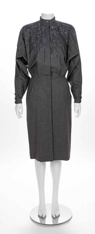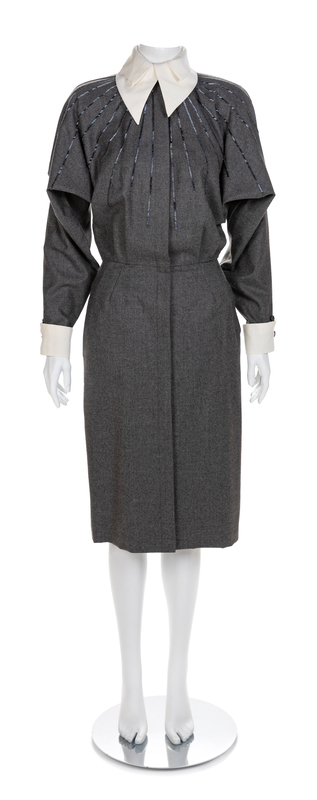 Grey wool dress with stand collar, shoulder pads and wide batwings embellished with metallic glass beads radiating out from neckline. The bodice of the dress is pleated into the waistline and are attached to a straight skirt with slip pockets at the sides. The dress opens entirely down the center front and closes with covered buttons. The skirt is lined with a grey lining woven with 'Gucci'. The buttons down the center front and on the sleeve hems feature the GG logo. A set of white detachable collars and cuffs accompany the ensemble and vary in shape. There are buttons on the inside of the collar, but not the sleeve hem.