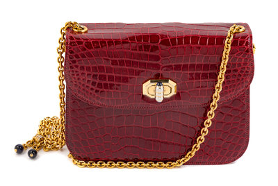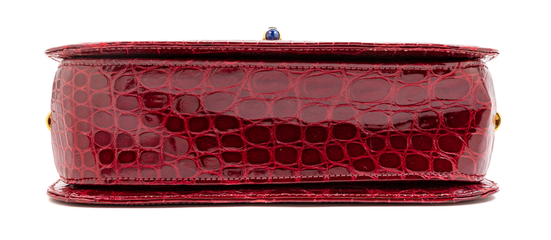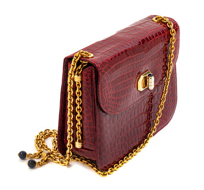 goldtone hardware with red interior with two slip pockets and one zip pocket with a chain shoulder strap. Together with a dust bag. Stamp: Gucci, Made in Italy.