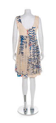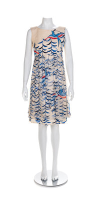 White sleeveless dress with a bird and plant print in blue and red. The underlined bodice has a wide scoop neck and a full crepe skirt gathers into the waistline. The dress closes down the center back with covered ball buttons, loops, snaps and a zip. Label: Hanae MoriA screen print label "Hanae Mori" can be found on the salvage of the fabric on the seam allowance.