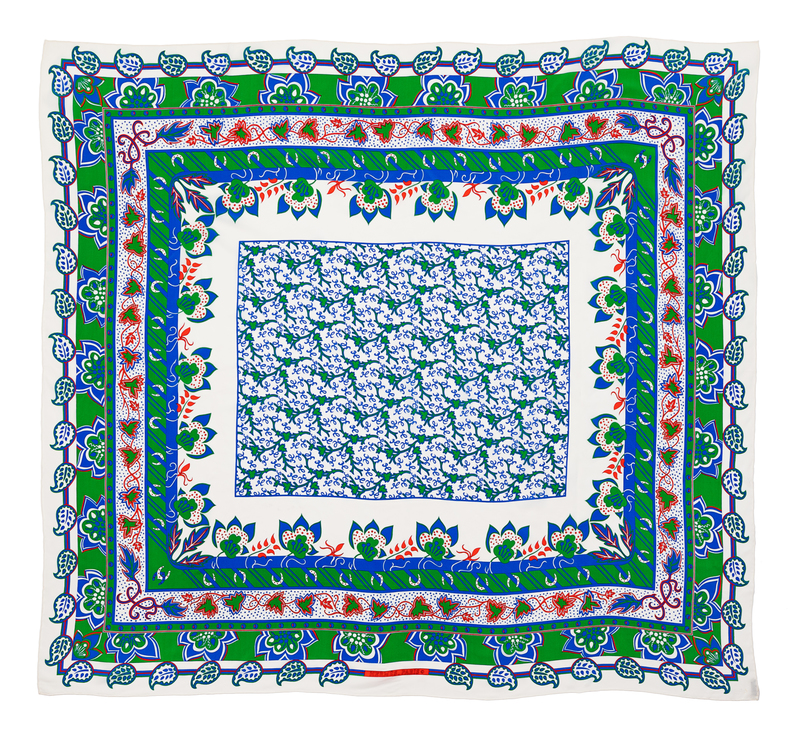 Cream with a ivy logo H, floral, leaf pattern in blue, green, and red. Labeled within the print: Herms