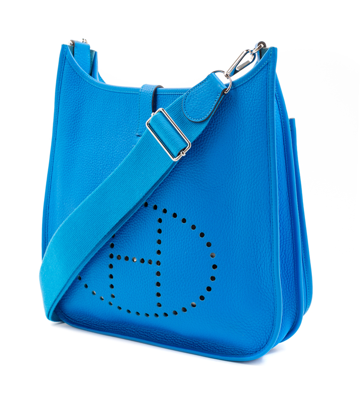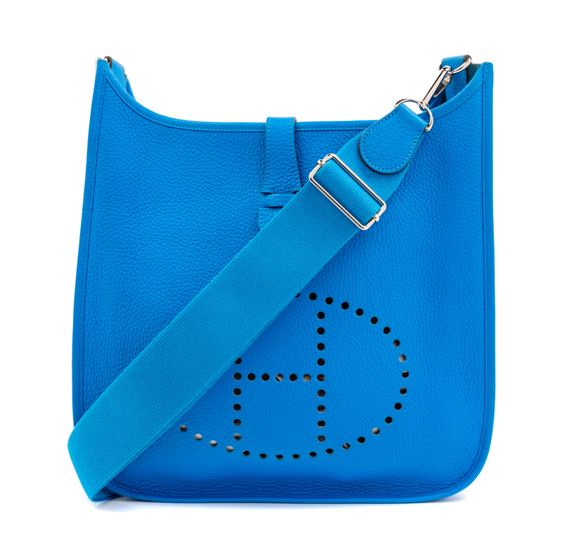 Hermès Blue Clemence Evelyne III GM Handbag, 2012 13" L x 4" W x 12" H; Strap drop: 19"- 27"