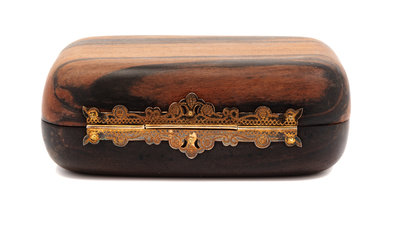 A curved-edge rectangular wooden clutch with ornate metal frame and clasp. Gold leather lining with goldtone mirror included. Label: Judith Leiber