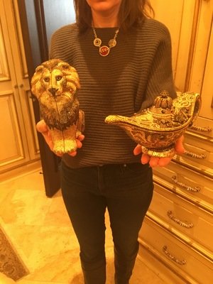 goldtone hardware, grey, orange, tan crystals, small black hard stone eyes, push button closure, interior gold lining with drop-in or removable chain shoulder strap. Together with dustbag and box. Stamp: Judith Leiber New York, Collector's Edition. Made in Italy