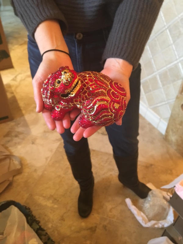 A Judith Leiber Limited Edition Red Foo Dog Minaudiere 6" L x 3.75" W x 4" H; strap drop: 24"