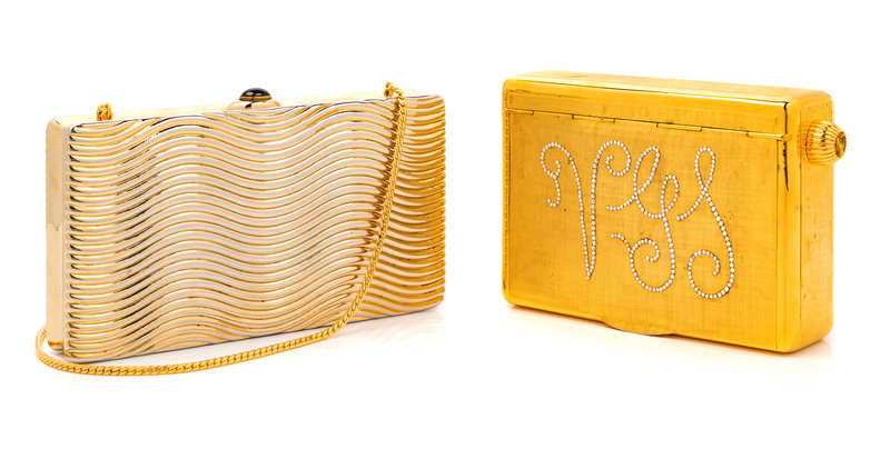 First: Rectangular goldtone with wave design and goldtone clasp with black glass. Goldtone strap and gold leather lining. Label: Judith Leiber Second: Rectangular goldtone box with hinged lid featuring 'VGL' in glass jewels. Gold leather lining. Label: Judith Leiber. Staining on exterior of metal. On right side of bag, cloth handle is missing.