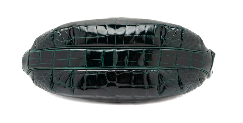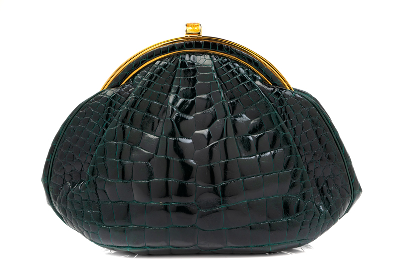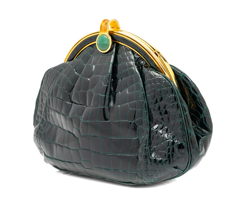 goldtone hardware, green crocodile frame with light green stone push down/lift locking clasp, green leather interior lining with a zip pocket and slip pocket, green skin shoulder strap. Together with a mirror. Label: Judith Leiber