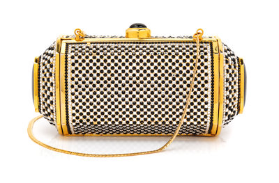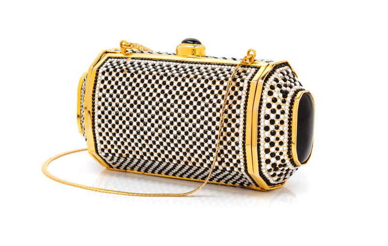 with white and black jewels set within a goldtone frame. Clasp and ends of cluth feature a large black glass piece. Gold chain strap and gold leather lining. Label: Judith Leiber