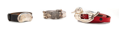 First 1990s: Barry Kieselstein sterling silver frog buckle and white belt. Second, 1981: Barry Kieselstein sterling silver duck slider buckle and red belt. Third: Unmarked silvertone buckle with black belt.