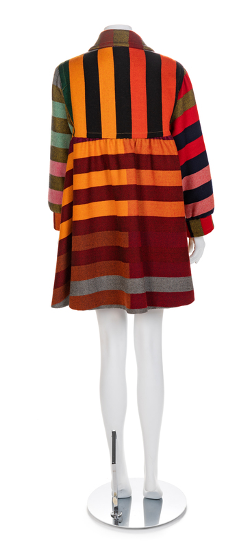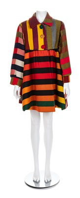 front velvet button closure, black, red, green, orange, yellow stripes, side slip pockets, and red interior lining. Label: Moschino, Cheap and Chic. Made in Italy.