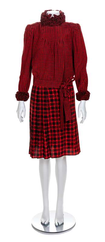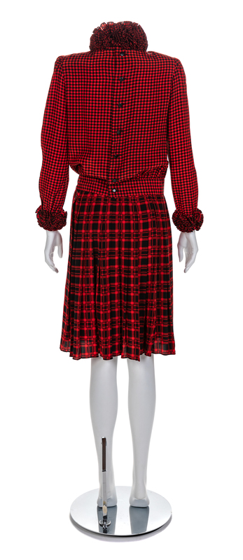 consisting of a blouse with a layered pleated ruffle neckline and cuffs, waist band with attached self-tie bow, unlined with shoulder pads and a back button closure. Together with a plaid pleated kilt skirt, unlined with a front side snap button and hook closure. Each labeled: Nina Ricci Boutique / Made in France