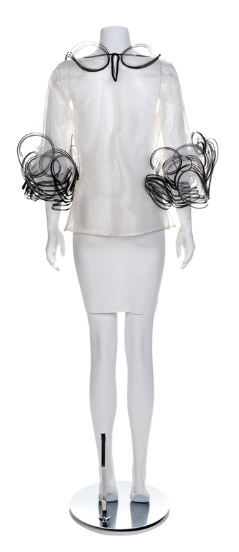 white tulle with black trim on sleeves and collar, decorative black sheer strips down front, white sheer lining with a side zip closure. Attributed to Oscar de la Renta