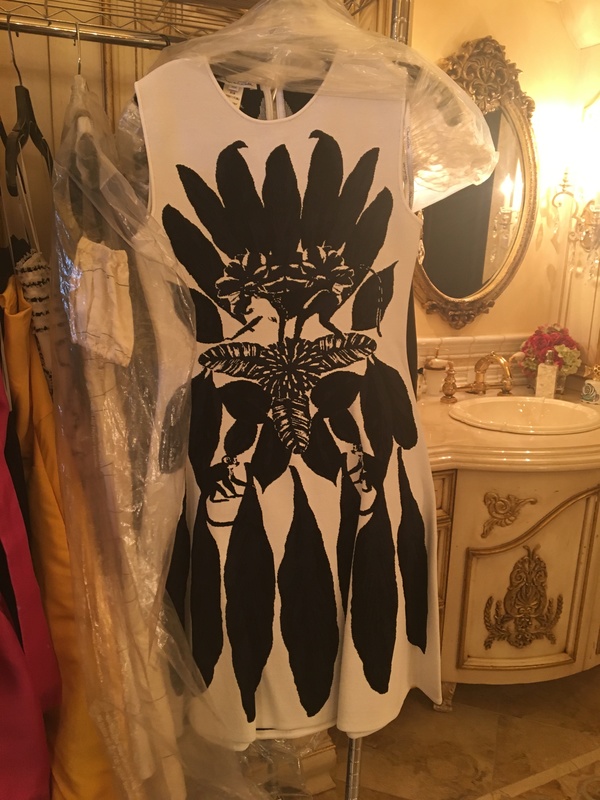 Sleeveless white knit dress with money and floral design with crewneckline and center back zipper closure. Label: Oscar de la Renta