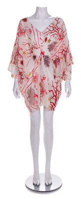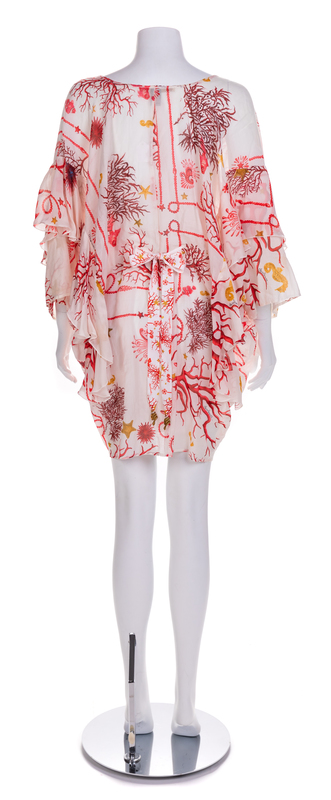 White cotton dress printed with an underwater theme with coral and other sealife with a v-neckline, long sleeves and a gathered waist. Label: Roberto Cavalli