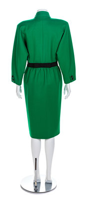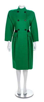 Green wool coat with stand collar, double breasted with black buttons and a black ribbon set-in belt with bow at back, front peplum, front slip pockets, green lining. Label: Valentino Boutique / Made in Italy