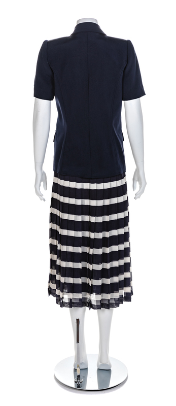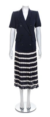 consisting of a short sleeved double breasted jacket with knotched lapel, single breast pocket, two faux front flap pockets, navy lining with front button closure. Together with a sheer pleated navy and white skirt with sheer navy lining with a back zip closure. Jacket label: Valentino BoutiqueSkirt attributed to Valentino Boutique
