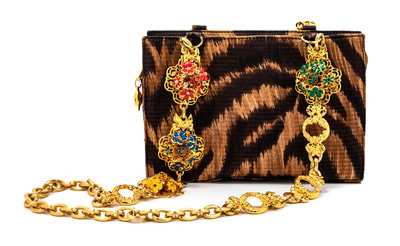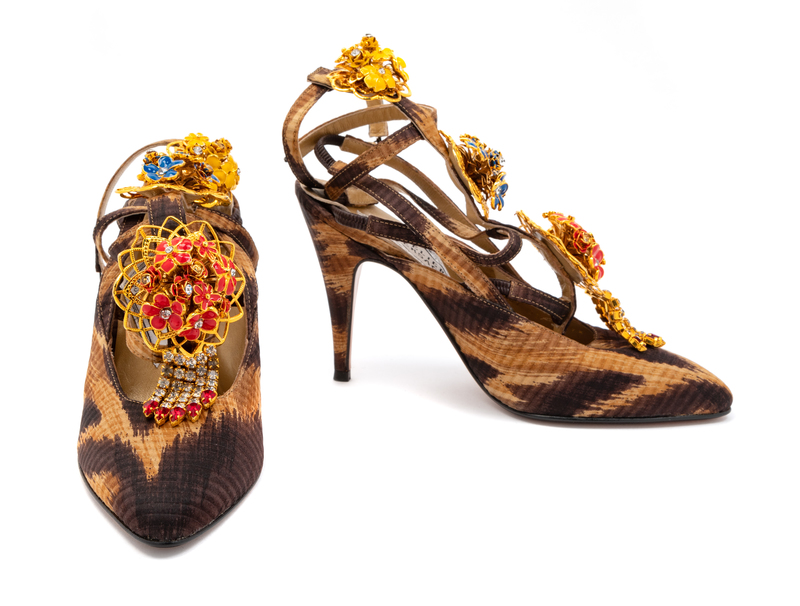 Handbag; animal print, goldtone hardware, one interior zip pocket, chain shoulder strap with decorative enameled blue, green, red, yellow flowers with rhinestones. Shoes; four inch heels, matching print with goldtone enameled flowers with rhinestones, ankle straps with hook and eye closure. Handbag Label: Gianni Versace Couture / Made in ItalyShoe Label: Atelier Versace
