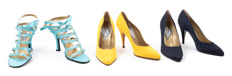 Baby blue strappy. Label: Gianni Versace, Made in Italy. Yellow ribbed. Label: Atelier Versace. Black satin. Label: Atelier Versace.