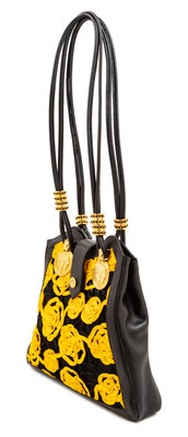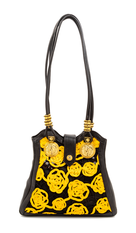 Gianni Versace Black Yellow Floral Handbag, 1990s 11.75" L x 2" W x 10.5" H; strap drop: 14"