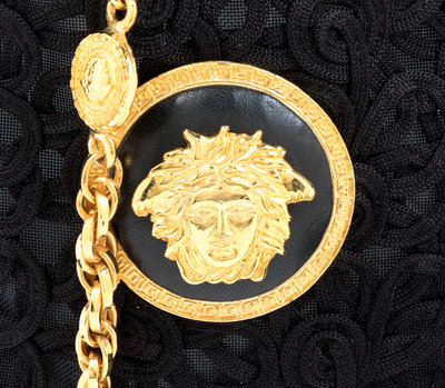Handbag; black mesh with ribbon embellishment, leather trim, a center raised leather and goldtone medusa medallion, goldtone hardware, decorative chain with a lobster clasp. Together with a dustbag.Stamp: Gianni Versace Couture, Made in ItalyShoes: black mesh with ribbon embellishment, 3.5" heels. Together with a Gianni Versace box. Stamp: Atelier Versace
