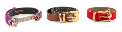 Purple: ribbed with silvertone hardware, pink rhinestones and a push pin closure. Red: ribbed with goldtone hardware, buckle with clear rhinestones. Brown: leather with silvertone and goldtone studs with goldtone medusa medallions and silvertone decorative medallions. Each Label: Gianni Versace, Made in Italy.