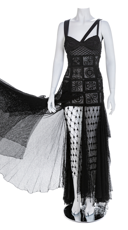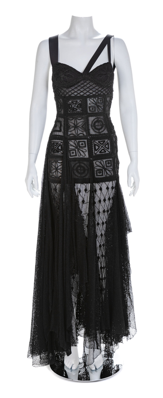 Fitted sheer silhouette extending to the high hip with emboidered floral motif in a variety of braids and top stitched shoulder straps. Hanging from the fitted sheer sheath is a long skirt of rope and small thread covered balls along with geometric panels of black net embroidered. Label: Atelier VersaceA version of this dress was worn by model Stephanie Seymour in a image by Richard Avedon in 1993.