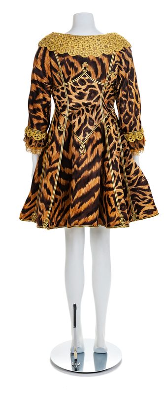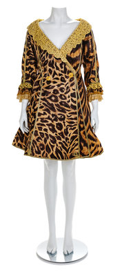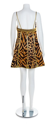 Jacket and dress made of animal print fabric and trimmed with gold and black thread braid. The jacket has a wide scoop neckline, dolman sleeves and closes at the center with two goldtone and rhinestone buttons. The neckline, and sleeve hems are trimmed with gold lace, pleated gold lace and pleated animal print sheer fabric. The jacket is lined with black and white animal print fabric woven with gold thread. The dress has an internal boned bodice, spaghetti straps of gold and black cord with an a-line skirt, empire waist embellished across front and back with small goldtone medallions, black and goldtone beads, goldtone semicurl paillettes, black and gold lame trim down front and back of dress, lined in black with a hidden side zip closure.Label: Atelier Versace