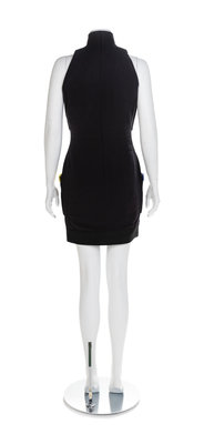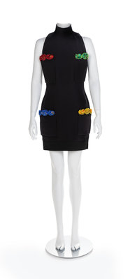 Black fitting silk crepe dress with a stand collar and hem of overstitched black silk. The body of the dress is embellished with hand-stitched patch pockets trimmed with appliques of red, green, blue and yellow silk and metal thread, glass bead and rhinestone embroidery. Black silk lining and center back zipper have been sewn in by hand. Label: Atelier Versace