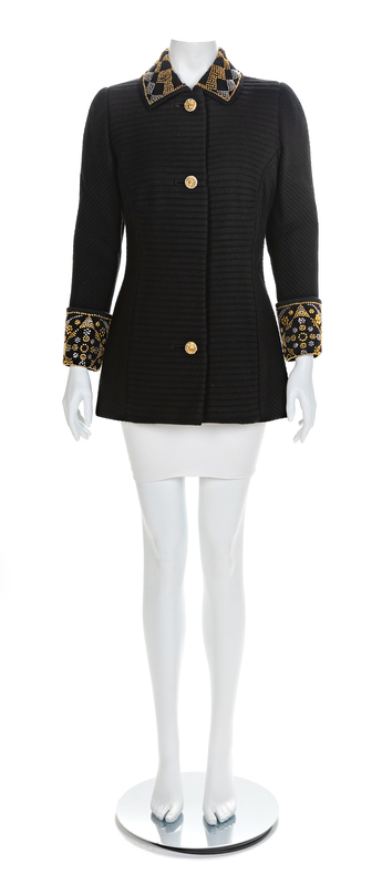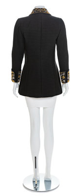 A black wool coat woven with horizontal bands and cut with long sleeves. The collar and sleeve cuffs are decorated with gold and silvertone studs in a geometric pattern. The coat closes down the center front with goldtone Medusa head buttons encircled with black and clear rhinestones. The black silk lining, cuffs and collar are sewn by hand.