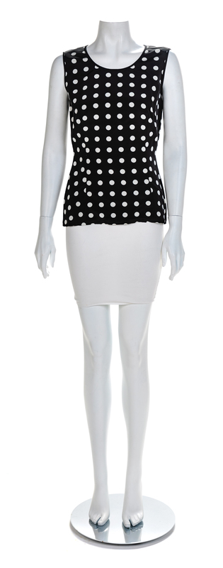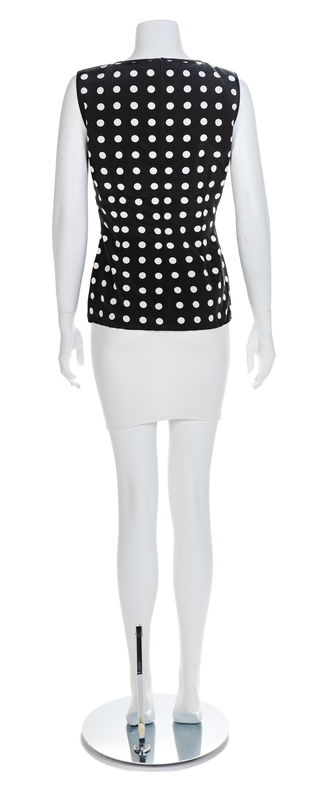 Sleeveless black ribbed silk top with white polka dots, crew neckline and a center back zipper and hook and eye closure. Bodice is lined with black silk hand-sewn into the top.