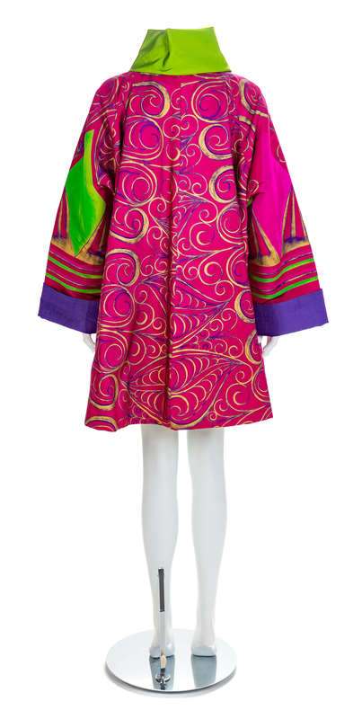 Fuschia, green, purple and gold printed silk coat with a wide sweeping hem and wide sleeves. Sleeves are cuffed with a top-stitched purple silk and the collar is made of a green silk moire. One goldtone button with orange jewel and a bound buttonhole close the coat at the neck. The coat is lined with a quilted green silk. Label: Gianni Versace / Made in Italy / Mod. 9660662 / Art. 4286-700