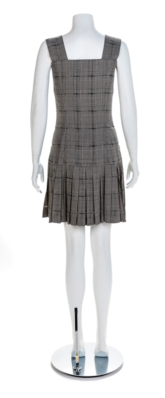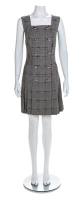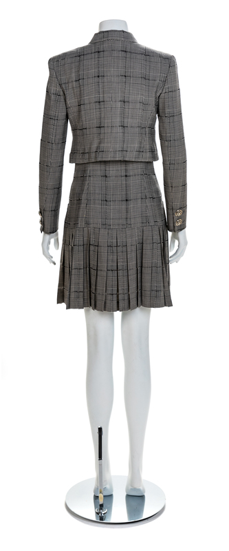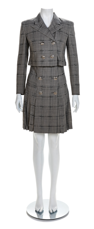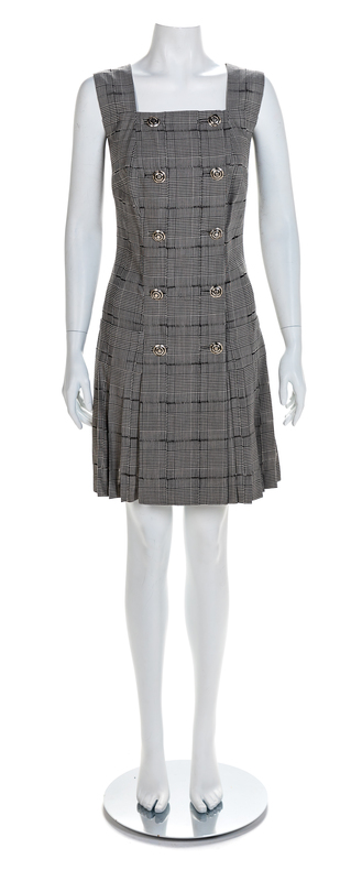 Black and white houndstooth with silvertone and black enamel buttons. The short jacket has a notched lapel, long sleeves with a two button hem and a center front double breasted button closure with bound buttonholes. A black silk lining has been hand-sewn into the jacket. The sleeveless dress has wide shoulder straps and is fitted through the bodice with decorative pockets flaps and a pleated skirt sewn into a dropped waistline. The bodice of the dress is lined with black silk, hand-sewn into the dress and opens all the way down the center front, which has a double breasted closure. Label: Atelier Versace