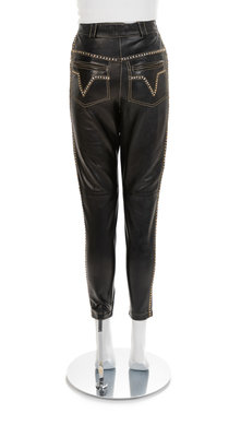 Black leather pants stitched with a gold metal thread with two front pockets, two back patch pockets with a zip closure, a wide waistband and a center front zipper closure. The pants are further embellished with a single row of rhinestones in alternating colors of gold and silvertone hardware. Trousers are fully lined and have zippers on the hem of the inseam. Label: Gianni Versace / Made in Italy