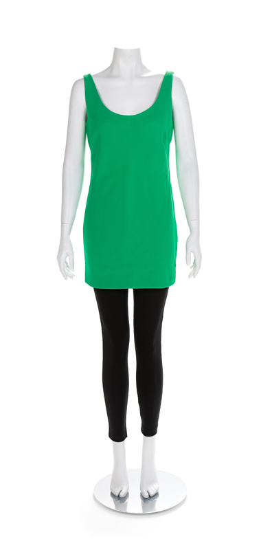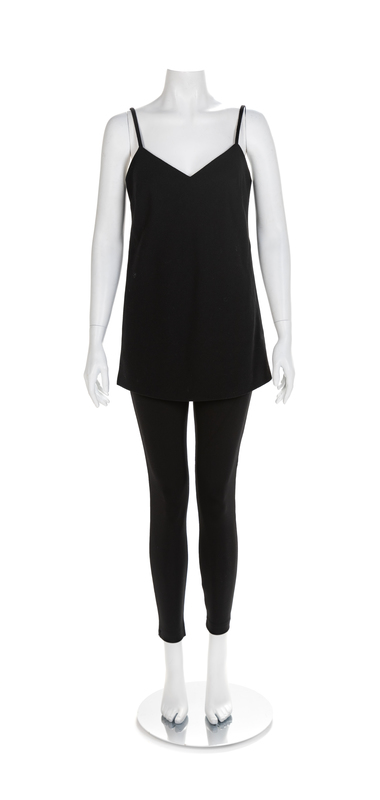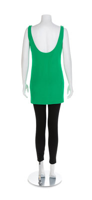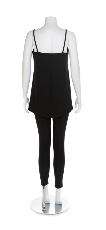 Sleeveless green silk pullover dress with wide scoop neckline and short hem. Green silk lining is sewn in by hand. Label: Atelier Versace Black silk crepe pullover mini dress with spaghetti straps. Black silk lining is sewn in by hand. Label: Atelier Versace Black stretch pants with thick waistband. Unlabelled: Attributed to Versace