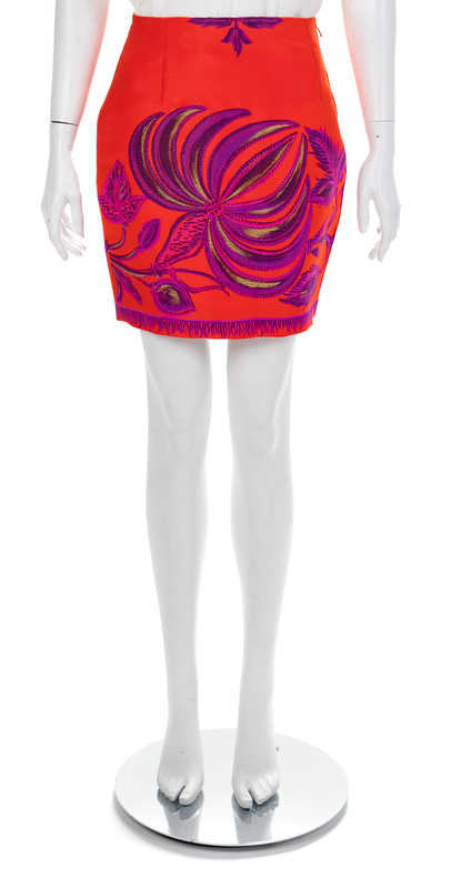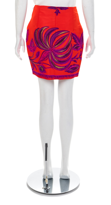 Red silk skirt printed with a purple and green floral design with red lining and side zip closure. Lining is sewn into the skirt by hand. Label: Atelier Versace