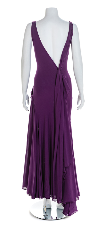 Sleeveless bias-cut purple silk crepe dress with complex cut and plunging v-neckline and dramatic tiered floorlength sweeping skirt. The dress secured as the center back with two purple fabric covered snaps. All of the hems of each panel and many of the decoartive finishing stitches are done by hand. Label: Atelier Versace