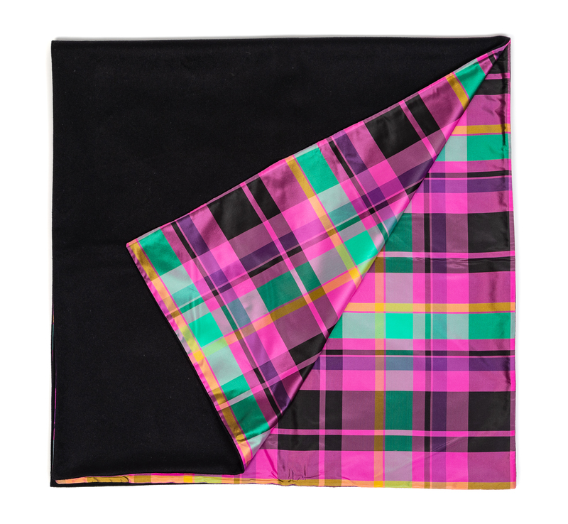 Long rectangular black wool scarf lined with plaid silk in pink, green, yellow and black. Unlabelled: Attributed to Versace