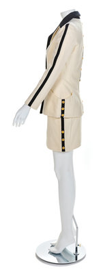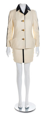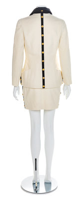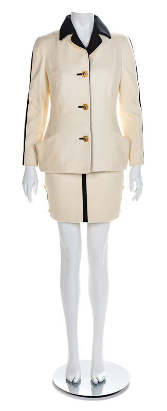 White wool trimmed with black wool and goldtone buttons. Jacket has a topstitched black lapel, long sleeves, wide hip pockets and black bound buttonholes down center front. Label: Atelier Versace