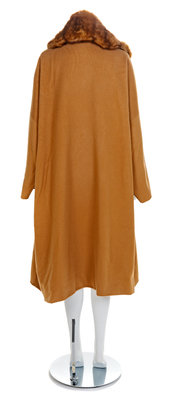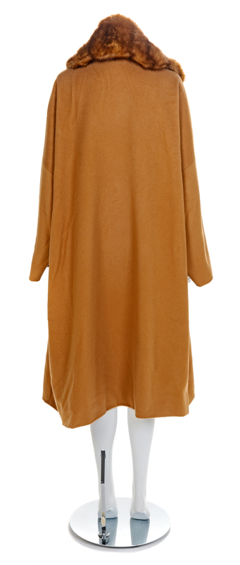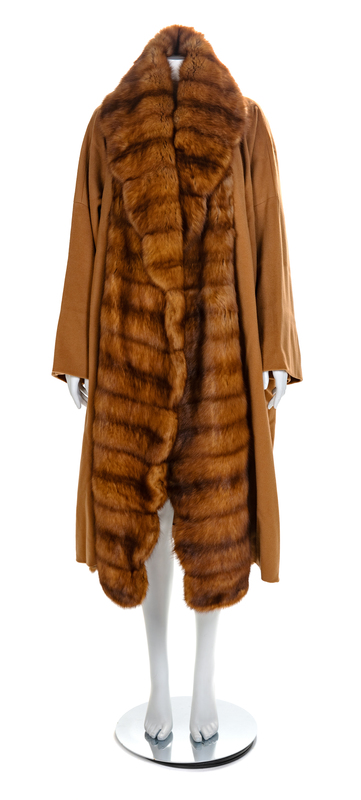 A wide, square cut brown wool coat with wide sleeves and trimmed with a 12" band of brown mink that extends up the center front and around the neck. The coat has a brown silk lining that has been sewn in by hand. Label: Atelier Versace
