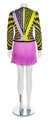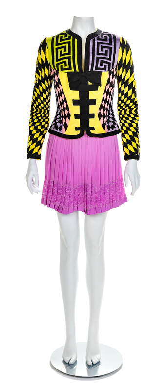 Jacket of green, purple, yellow and pink silk with an embroidered geometric pattern in black silk. The center front has a crew and v-neckline with a top-stitched black bow and horizontal bars tabs. Long fitted sleeves with a black cuff and a center back separating zipper. The jacket is lined with yellow ribbed silk. Pleated purple silk crepe skirt with purple lace insertion near hem and purple silk lining. Skirt closes at the side seam with snaps and hook and eyes. Label: Atelier Versace / Made in Italy / 100% silk